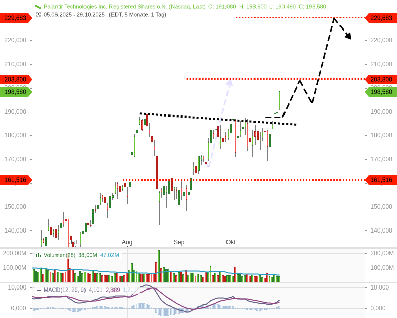 Die Aktie hat seit August erneut ein bullisches Signalmuster ausgebildet, eine Cup+Handle. Das ist eindeutig kein bärisches Topingsignal! Die Aktie verbrennt reihenweise Shortseller, die die Aktie wegen der irrsinnig hohen Bewertung leerverkaufen und auf fallende Kurse spekulieren. Das Signalmuster seit der letzten Wochen zeigt weiteren Kaufdruck in der Aktie, da sind nach wie vor Käufer aktiv. Es macht meines Erachtens mehr Sinn, in Richtung des Hauptverkehrs auf der Palantir-Autobahn zu fahren, als sich auf ihr als Geisterfahrer zu bewegen. Shortseller sind derzeit noch immer in der Rolle der Geisterfahrer. Steigt Palantir auf Tagesschlusskursbasis überzeugend dynamisch über 188 USD an, aktiviert das prozyklisch ein neues Kaufsignal mit Projektionszielen bei 203 und 229 USD. Am 3. November wird Palantir übrigens Quartalszahlen für das dritte Quartal 2025 veröffentlichen. Diesen Termin gilt es als aktiver Anleger im Blick zu behalten, weil diese Termine das Potential haben, einen Trend zu drehen.