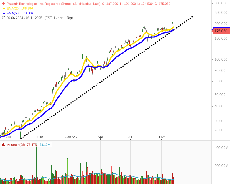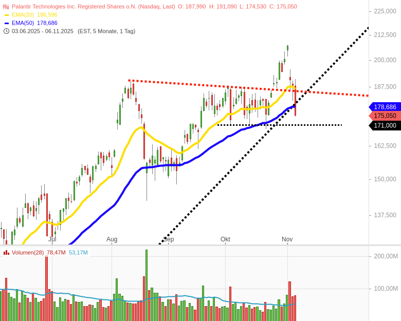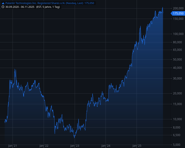 - Palantir Technologies Inc. Registered Shares o.N.Kursstand: 175,040 $ (Nasdaq) - Zum Zeitpunkt der VeröffentlichungVerkaufenKaufen