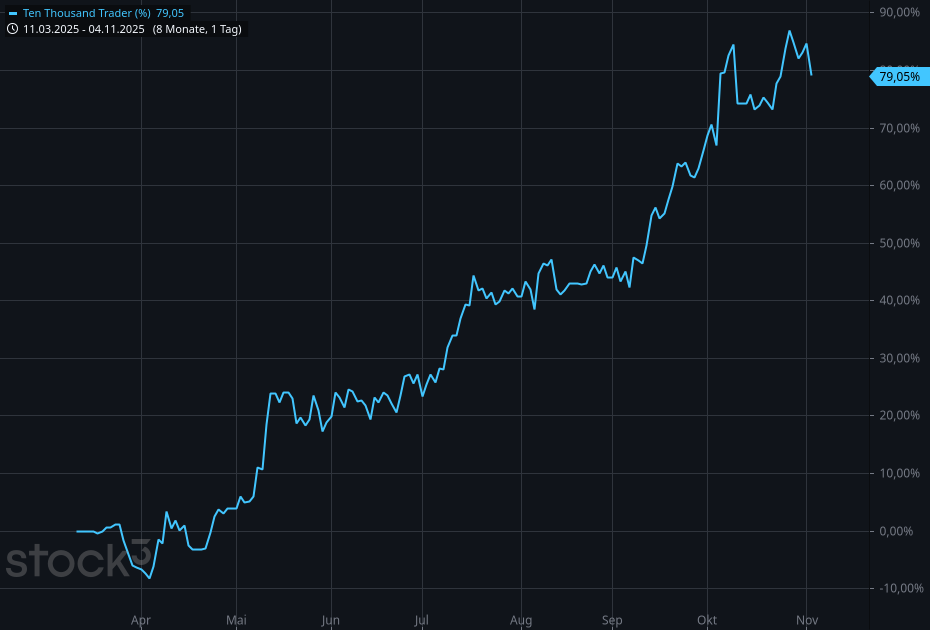 Und +79% seit März dieses Jahres im kleinen Depot (10.000 € auf 17.760 € hochgehandelt ... seit März). Beide Depots sind Teil von stock3 Trademate und werden von unserer Leserschaft gerne nachgebildet.