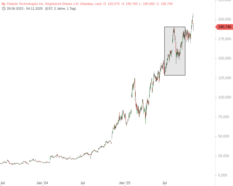 - Palantir Technologies Inc. Registered Shares o.N.Kursstand: 190,740 $ (Nasdaq) - Zum Zeitpunkt der VeröffentlichungVerkaufenKaufen