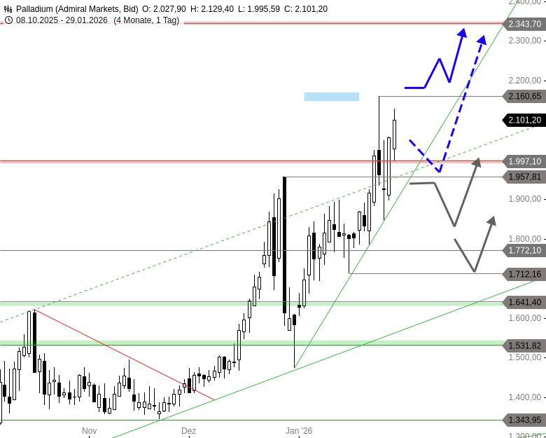 Rückblick: Der von teils heftigen Korrekturphasen durchzogene, dennoch enorm dynamische Aufwärtstrend bei Palladium hat in den letzten Tagen ausgehend von einem Tief bei 1.474 USD Ende Dezember die Hürden bei 1.957 USD und 1.997 USD überrannt. In der Spitze erreichte die Kaufwelle einen Kurs von 2.157 USD und damit den höchsten Stand seit Oktober 2022. Am gleichauf liegenden Kursziel bei 2.160 USD prallte der Wert zuletzt scharf nach unten ab. Allerdings startete bereits bei 1.847 USD der nächste Konter, der jetzt zum Angriff auf das Hoch führt.