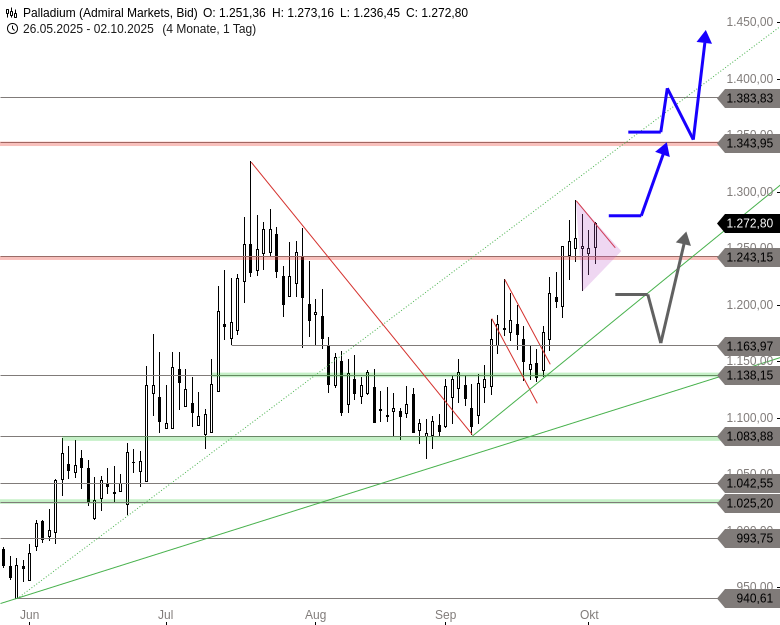 Rückblick: Seit dem Tief aus dem Frühjahr 2024 befand sich Palladium in einer breiten Bodenbildungsphase, die mit dem Anstieg über das Hoch bei 1.243 USD im Juli dieses Jahres nach oben durchbrochen wurde. In der Spitze erreichte der Kurs 1.327 USD, ehe eine weitere Zwischenkorrektur begann. Diese wurde Ende August auf Höhe der Unterstützung bei 1.083 USD gestoppt und in einen weiteren Anstieg überführt, der aktuell deutlich an Dynamik gewinnt. Zuletzt wurde eine bullische Flagge nach oben durchbrochen und der Widerstand bei 1.243 USD erneut überschritten.
