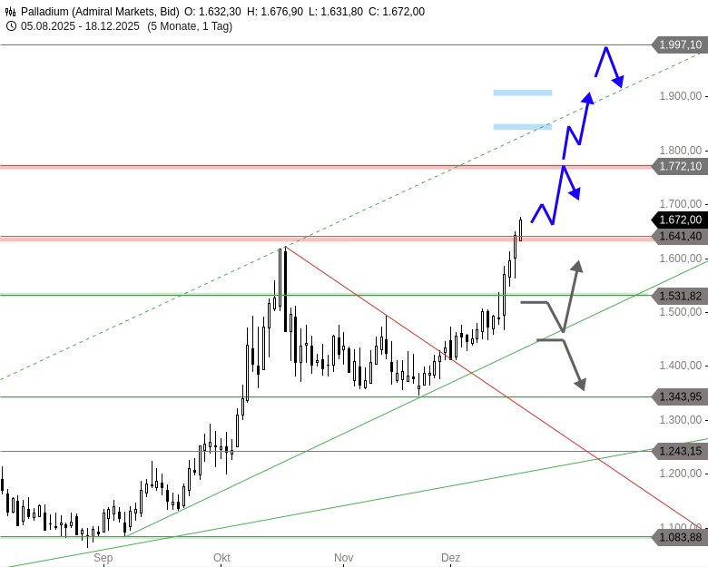 Charttechnischer Ausblick: Der Schlussspurt bei Palladium hat im Bereich von 1.665 USD ein kleines Kursziel, an dem eine Pause folgen kann. Das große Ziel der Rally ist aber der Widerstand aus dem Jahr 2022 bei 1.772 USD. Hier wäre eine größere Korrektur zu erwarten. Oberhalb von 1.800 USD könnte der Palladiumkurs später sogar schon bis 1.850 USD und 1.905 USD steigen. Der nächste langfristige Widerstand oberhalb von 1.772 USD liegt dagegen erst bei 1.997 USD.