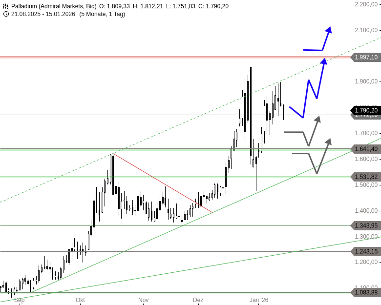 Palladium Unterstützungen: 1.700 + 1.641 + 1.531