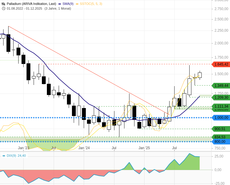 Im Monatschart bildet Palladium seit Anfang 2024 eine deutliche Bodenstruktur aus. Die 200-Tage-Linie, die im Monatschart annähernd der Neun-Monatslinie entspricht, glättet diese Entwicklung und zeigt den stabilen Trendwechsel noch klarer. Besonders auffällig sind zwei zentrale Preisbereiche: Der Unterstützungsbereich um 834 USD je Feinunze hat in den vergangenen Monaten mehrfach gehalten. Darüber hinaus spielt die Zone um 1.000 USD eine wichtige Rolle, da sie eine psychologisch relevante Schlüsselmarke darstellt.