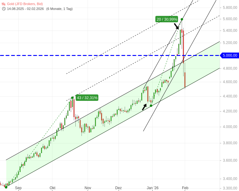 Wir sehen zwei starke Aufwärtswellen; die erste von August bis Oktober 2025, als der Goldpreis in nur 43 Handelstagen um +32,3 % stieg. Die zweite ging in der Vorwoche zu Ende und war noch steiler: +31 % in nur 20 Handelstagen – also fast der gleiche Anstieg in nur der Hälfte der Zeit!