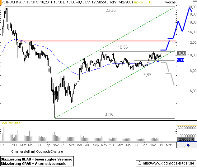 Charttechnischer Ausblick: Die Petrochina Aktie steht kurz vor einem Rallyschub. Ein nachhaltiger Ausbruch über die 10,65 $-Marke sollte für deutlichen Kapitalzufluss sorgen und eine steile Aufwärtsbewegung bis 12,20 - 12,50 und mittel- bis langfristig zum Allzeithoch bei 20,25 $ einleiten.