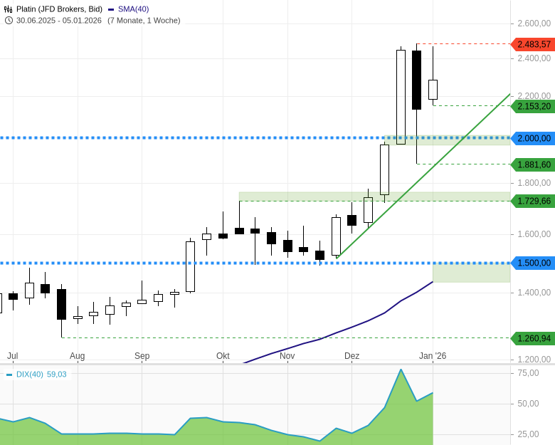 Aus charttechnischer Sicht befindet sich Platin weiterhin in einem intakten Aufwärtstrend, allerdings klar im überkauften Bereich. Das Risiko kurzfristiger Gewinnmitnahmen ist damit noch nicht vom Tisch. Die aktuell entscheidenden Marken für Trader lauten: