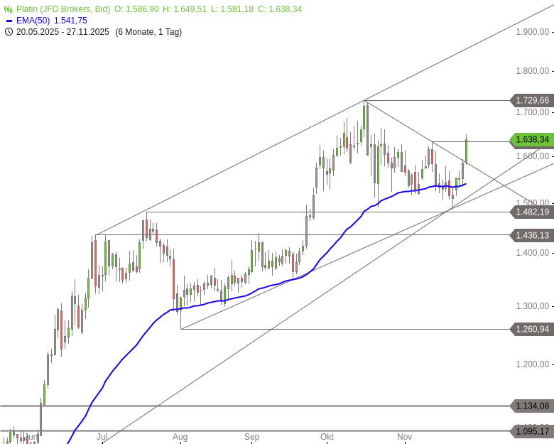Nachdem Platin im Oktober ein Hoch bei 1.730 USD markierte, gingen die Notierungen in eine Konsolidierungsphase über. Innerhalb dieser Bewegung rutschte der Kurs bis zur Unterstützungszone um 1.482 USD zurück, die erfolgreich gehalten wurde. Ausgehend vom mittelfristigen Aufwärtstrend gelang nun der Ausbruch über den dabei entstandenen kurzfristigen Abwärtstrend. Damit hellte sich das Chartbild spürbar auf.