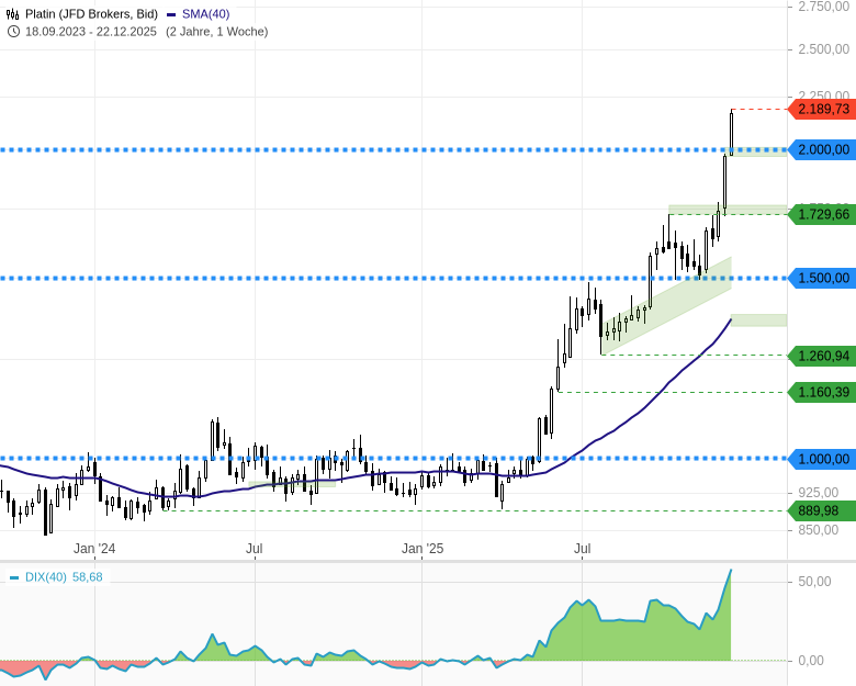 Charttechnisch präsentiert sich Platin weiterhin in sehr guter Verfassung. Der Aufwärtstrend hat sich zuletzt sogar beschleunigt. Gleichzeitig steigt jedoch das Risiko kurzfristiger Gewinnmitnahmen. Der aktuelle Preis liegt inzwischen rund 60 % über dem Durchschnitt der vergangenen 200 Handelstage, gut sichtbar im DIX-Indikator.