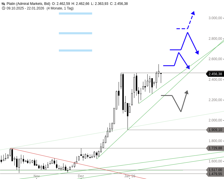 Rückblick: Die massive Rally, die bei Kursen um 900 USD im April 2025 gestartet war, hatte Platin über eine ganze Reihe langfristiger Widerstandsmarken angetrieben. Der Ausbruch über die Oberseite eines Trendkanals sorgte im Dezember für einen weiteren Aufwärtsschub, der auf ein Rekordhoch bei 2.465 USD führte. Nach einer sehr scharfen, aber nur drei Tage dauernden Korrektur zog der Kurs wieder an das Rallyhoch an und bildete darunter ein ansteigendes Dreieck aus. Die bullische Formation wurde zuletzt bereits kurz nach oben verlassen.