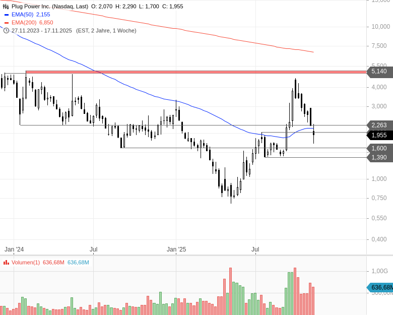 - Plug Power Inc. - WKN: A1JA81 - ISIN: US72919P2020 - Kurs: 1,955 $ (Nasdaq)