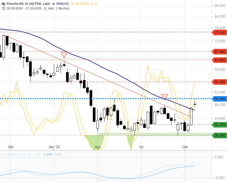 Langfristig überzeugt der Kurs mit einer soliden Support-Linie bei 39,60 EUR: eine Unterstützung, die sich bis in den April zurückverfolgen lässt. Ein Ausbruch über die langfristige Abwärtstrendlinie und die 200-Tage-Linie könnte der Porsche-Aktie neues Momentum verleihen. Trader sollten die Marken bei 50,00 EUR (Widerstand) und 47,00 EUR (Support) genau im Blick behalten.