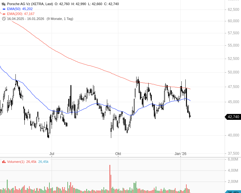 Fazit: Porsche blickt auf ein herausforderndes Jahr 2025 zurück, das von rückläufigen Absätzen in fast allen Regionen und strukturellen Veränderungen im Modellportfolio geprägt war. Der deutliche Rückgang der Auslieferungen spiegelt nicht nur die Nachfrageschwäche in wichtigen Märkten wie China wider, sondern auch die Auswirkungen regulatorischer Anforderungen und der strategischen Neuausrichtung. Entscheidend wird sein, ob es dem Unternehmen gelingt, mit der geplanten Modelloffensive und dem Fokus auf Profitabilität wieder auf einen Wachstumskurs zurückzukehren. Die Aktie hat sich 2025 an einer Bodenbildung versucht. Angesichts der keineswegs günstigen Bewertung sollte bei Porsche jetzt möglichst nicht mehr viel schiefgehen, damit die Tiefs aus dem vergangenen Jahr bei 40 EUR nicht doch noch unterschritten werden.