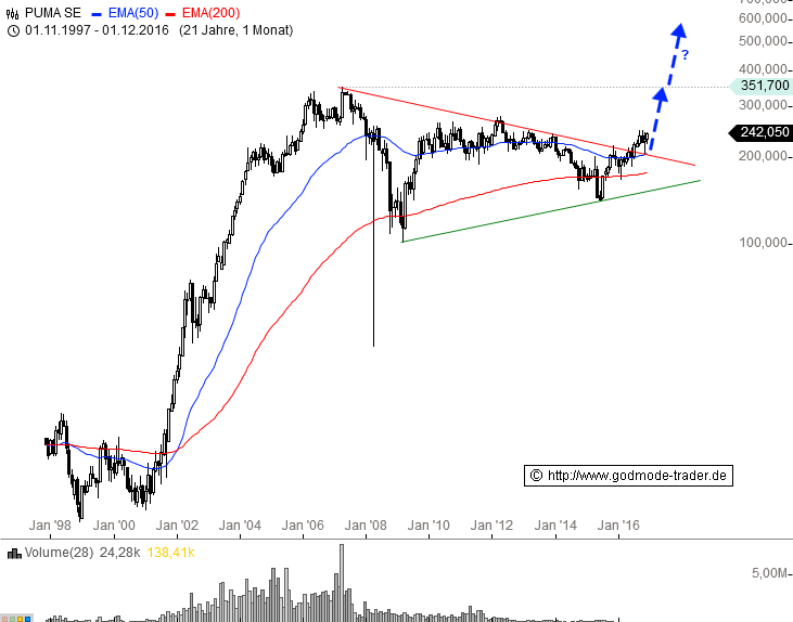 Von 2001 bis 2007 zählte die Puma-Aktie zu den stärksten deutschen Aktien und legte eine unglaubliche Rally aufs Parkett und kletterte von 11,91 bis auf 351,70 EUR. Seit dem ist die Luft raus, der Aktienkurs pendelte sich nach einer ersten heftigen Abwärtskorrektur seitwärts ein, die Handelsspanne nimmt seit Jahren ab.
