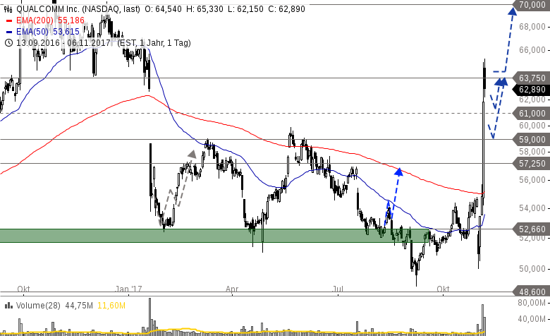 Kommen wir zum Chart. Ich hatte Qualcomm in den letzten Monaten mehrfach zum Einstieg empfohlen, muss jedoch auch zugegen, dass die Bodenbildung weitaus länger gedauert hat als erwartet. Eine ganze Reihe von Großinvestoren hat die Chance genutzt und ist eingestiegen, hier finden Sie den Artikel zum Thema: "Hier steigen Großinvestoren ein". Die fundamentale Analyse zu Qualcomm finden Sie in meinem letzten Artikel "QUALCOMM – Hier wird seit Monaten gekauft"
