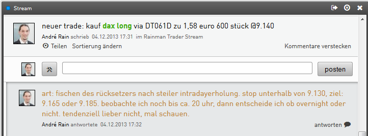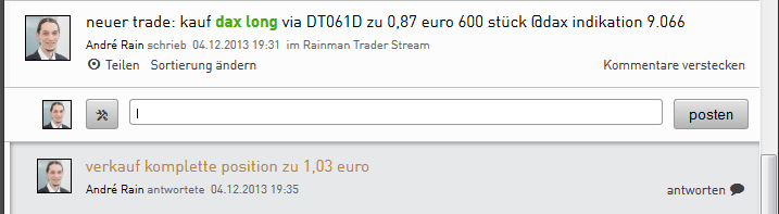 Warum erzähle ich euch von einer Tradingsituation, in der ich mich nicht an meine Regeln gehalten habe und mich dazu noch denkbar ungeschickt angestellt habe? Das könnte ja ein schlechtes Licht auf mich werfen. Letztlich muss das jeder von euch selbst beurteilen. Ich trade öffentlich im Rainman Trader, auch auf die Gefahr hin, mich womöglich zu blamieren, eine schlechte Phase zu haben oder einen fatalen Fehler zu machen. Warum tue ich das dann? Weil es bei mir in den letzten Jahren ganz gut lief im Trading und ich Freude daran habe, meine Erlebnisse und Erfahrungen zu teilen. Das ist auch das Ziel des ganzen Projekts: Sowohl mit Neulingen als auch mit Profis im Trading Erfahrungen und Ansichten zu teilen, um daraus zu lernen und zu profitieren.