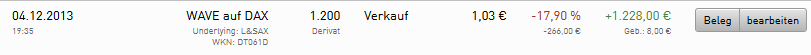 Doch zurück zum Trade: Wie im letzten Bild zu sehen, bin ich dann keine 5 Minuten später komplett aus den beiden Trades ausgestiegen. Übrig blieb ein Verlust von 266 Euro oder ca. 1,2% vom Gesamtdepotwert.