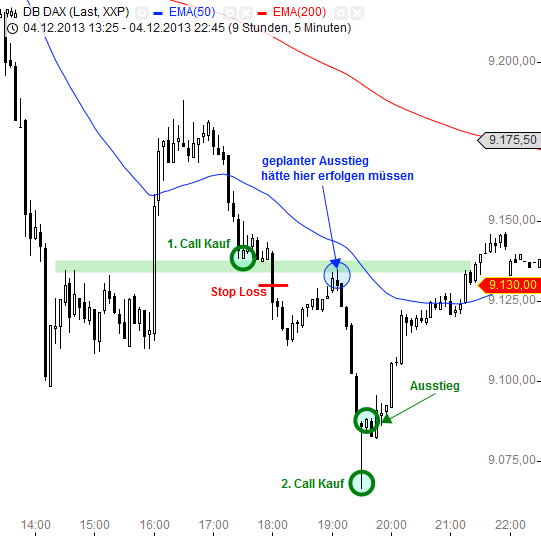 Doch warum zum Teufel bin ich schon so früh ausgestiegen? Das waren die Nerven. Wie oben beschrieben war der psychische Druck in dem Moment sehr groß, die Angst vor erneuten, größeren Verlusten (ich war ja bereits 444 Euro in den Miesen gewesen!) hat mich aus dem Trade gezerrt. Ob diese Entscheidung aus strategischer Sicht (Moneymanagement!) richtig war oder nicht, sei dahingestellt. Mit Blick auf den Chart und den weiteren Verlauf war sie denkbar ungünstig.