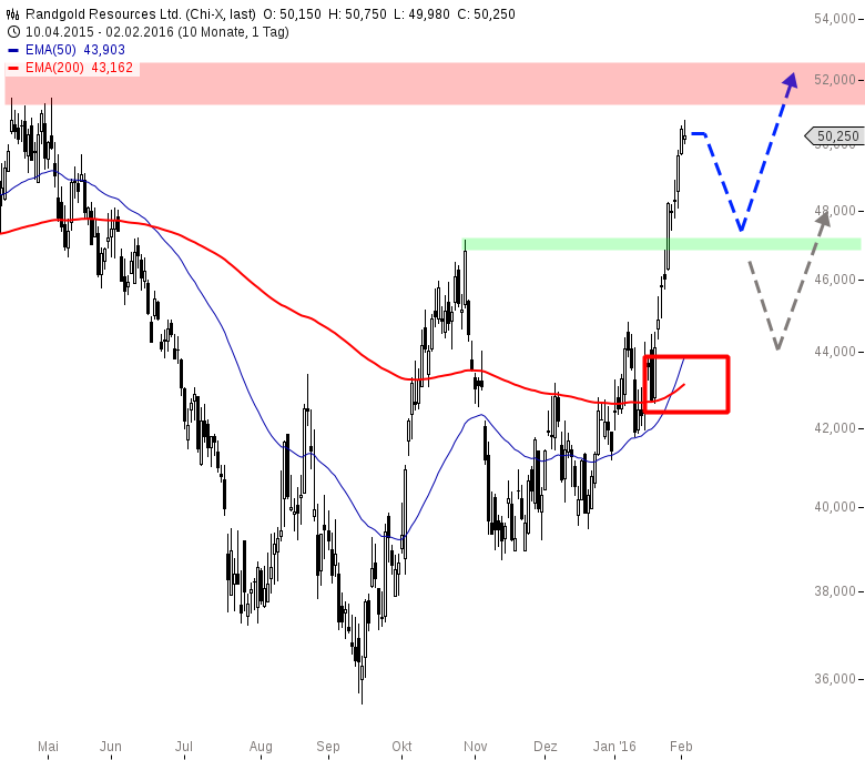 Die vergangenen vier Wochen waren ein Fest für Randgold-Aktionäre: Wie an der Schnur gezogen legte die Aktie um über 20 % zu seit Anfang Januar. Der EMA50 hat den EMA200 mittlerweile gekreuzt und ein Kaufsignal generiert.