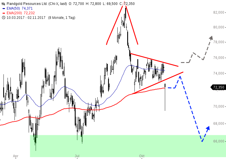 In dem Fall wäre in den kommenden Handelswochen mit weiteren Abgaben Richtung 66,00 GBP zu rechnen aus charttechnischer Sicht. Erst oberhalb von 75 GBP würde sich das Chartbild wieder entscheidend aufhellen. Bis dahin dominieren vorerst die Abwärtsrisiken bei Randgold.