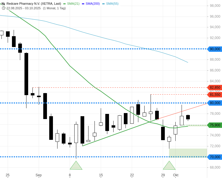 Mein Fazit: Die Analysten träumen mit Blick auf die Aktie der Redcare Pharmacy N.V. von Kurszielen weit über 150 EUR, während der Markt die Aktie noch kritisch sieht. Kurzfristig entscheidet die 80-EUR-Marke über den nächsten Move. Trader sollten Redcare auf der Watchlist behalten – der Oktober mit den Q3-Zahlen könnte den Knoten lösen.
