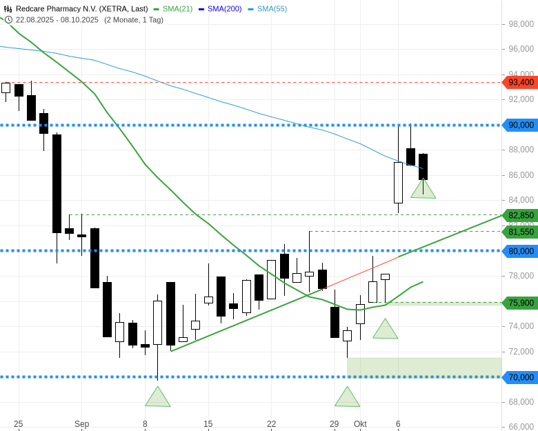 Technisch sieht’s richtig gut aus: Mit den frischen Zahlen hat Redcare Pharmacy das Comeback eingeläutet. Die Marke von 80 EUR wurde zurückerobert, nachdem die Aktie bereits im September/Oktober eine saubere Bodenbildung hingelegt hatte. Die 21-Tagelinie drehte frühzeitig nach oben und fungierte als solider Support.