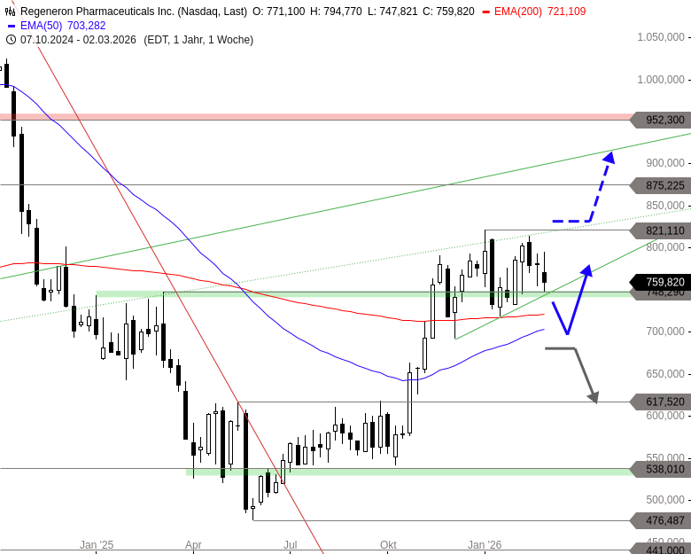 Charttechnisches Fazit: Es bleibt abzuwarten, ob die heutige Meldung der Aktie von Regeneron Rückendeckung gibt und ein Einbruch unter 748,29 USD in Richtung 711 USD noch verhindert werden kann. Eine Verteidigung des Supports wäre grundsätzlich bullisch zu werten und könnte die Voraussetzung für einen Ausbruch über 794,77 und 821,10 USD schaffen.