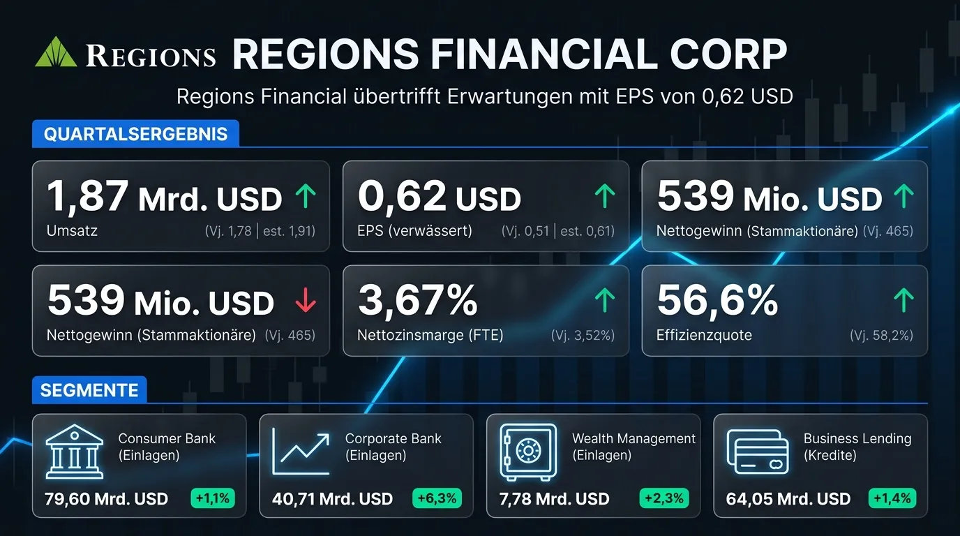 Regions Financial Corp. hat im ersten Quartal 2026 einen Nettogewinn von 539 Mio. USD und ein verwässertes Ergebnis je Aktie von 0,62 USD erzielt und damit die Analystenerwartungen von 0,61 USD leicht übertroffen. Der Gesamtumsatz stieg im Jahresvergleich um 5 Prozent auf 1,87 Mrd. USD, blieb jedoch knapp unter der Konsensschätzung von 1,91 Mrd. USD. Das Nettoeinkommen legte im Vergleich zum Vorjahresquartal um 16 Prozent zu, während das Pre-Tax-Pre-Provision-Ergebnis um 8 Prozent anzog. Die Kreditqualität verbesserte sich weiter: Notleidende Kredite sanken auf 0,71 Prozent der Gesamtdarlehen, und die Nettoabschreibungsquote ging auf annualisiert 0,54 Prozent zurück. CEO John Turner verwies auf Wachstumsdynamik bei Krediten und Einlagen sowie Fortschritte bei Technologie- und KI-Investitionen als Grundlage für die strategischen Jahresziele.