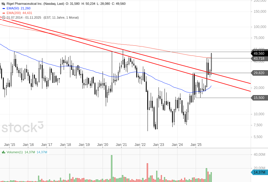 - Rigel Pharmaceutical Inc.Kursstand: 49,560 $ (Nasdaq) - Zum Zeitpunkt der VeröffentlichungVerkaufenKaufen