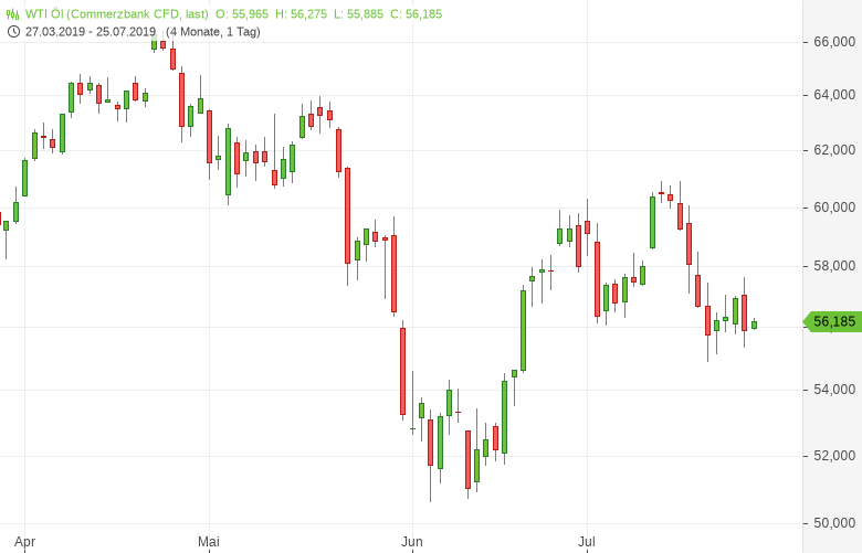 Schwache Wirtschaftsdaten aus der deutschen und der US-amerikanischen Industrie hatten zur Wochenmitte Konjunktursorgen befördert und den Ölpreis unter Druck gebracht. Ein wenig Unterstützung brachte am Abend der jüngste US-Ölmarktbericht. Demzufolge sind die US-Rohöllagerbestände in der Woche bis zum 19. Juli 2019 überraschend deutlich um 10,84 Millionen Barrel gefallen. Analysten hatten im Konsens lediglich mit einem Rückgang um 4,01 Millionen Barrel gerechnet, nach minus 3,12 Millionen Barrel in der Vorwoche.