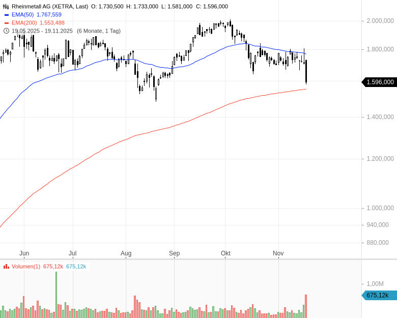- Rheinmetall AGKursstand: 1.596,000 € (XETRA) - Zum Zeitpunkt der VeröffentlichungVerkaufenKaufen