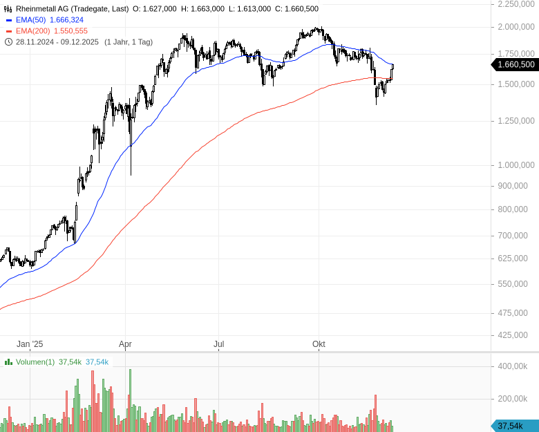 - Rheinmetall AGKursstand: 1.650,500 € (XETRA) - Zum Zeitpunkt der VeröffentlichungVerkaufenKaufen