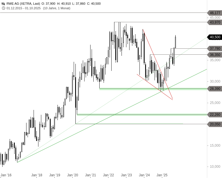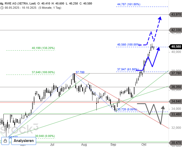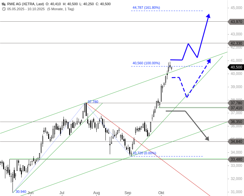 Charttechnisches Fazit: Die Aktie von RWE hat oberhalb von 41 EUR alle Chancen, das Hoch aus dem Jahr 2022 bei 43,97 EUR zu erreichen und sogar kurz zu überschreiten.