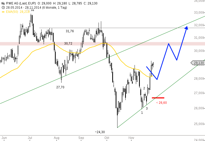 Nach dem kleinen 123-Tief bei 25,92 Euro schaffte die RWE Aktie mit den folgenden Kursgewinnen bis auf das aktuelle Zwischenhoch bei 29,27 Euro auch eine größere Umkehrformation. Die Kurse sind zurück über dem 20iger Durchschnitt und konnten zudem den Widerstandsbereich bei 27,70 Euro zurückerobern. Damit scheint in der Aktie der Turnaround gelungen zu sein, so dass nun weitere Kursgewinne bis auf 30,72, 31,76 und 32,98 Euro folgen könnten. Um jedoch auch mittelfristig wieder in einen uneingeschränkten Käufermarkt zurückzukehren, müsste letzterer Preisbereich nachhaltig durchbrochen werden.