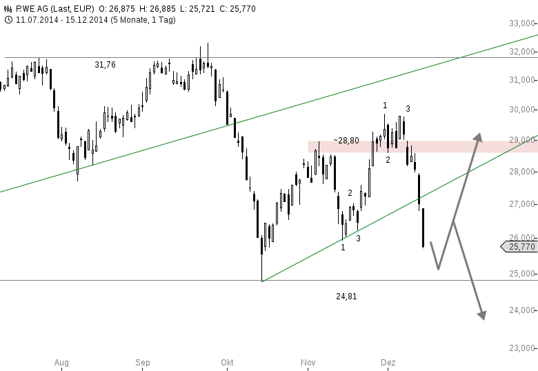 Investoren in der RWE Aktie kommen einfach auf keinen grünen Zweig und kurzfristig bullische Impulse fallen seit Monaten immer wieder wie ein Kartenhaus zusammen. So konnten die Käufer zuletzt auch die etwas oberhalb von 24,30 Euro stattfindende Trendumkehr nicht nutzen. Der Ausbruch über 28,80 Euro und das damit verbundene Kaufsignal blieben schon bei 2,86 Euro stecken und es kam zur direkten Trendumkehr mittels eines kleinen 123-Hochs. Seit dem stürzt der Kurs mächtig ab und erreichte gestern den Ausgangspunkt des jüngsten Rallyversuchs bei 25,92 Euro.