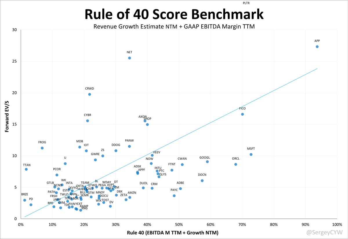 Der Scatterplot zeigt auf der X-Achse die Rule of 40 (EBITDA Margin TTM plus Revenue Growth Estimate NTM) und auf der Y-Achse das Forward EV/S (Enterprise Value to Sales, nächste 12 Monate).