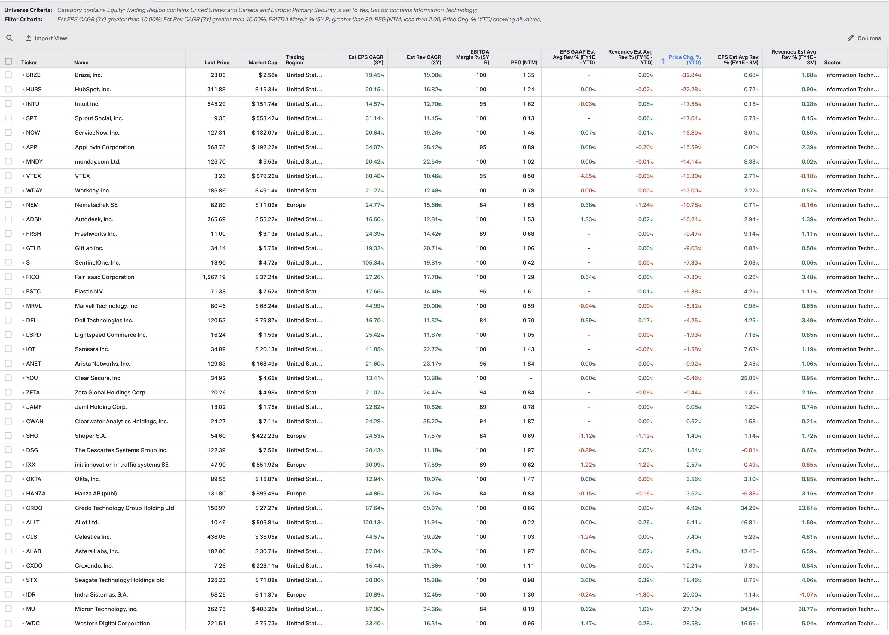 Alle aufgeführten Unternehmen stammen aus dem Sektor Information Technology, handeln entweder in den Vereinigten Staaten oder Europa, und erfüllen die im Filter hinterlegten Kriterien: geschätztes EPS-Wachstum und Umsatzwachstum jeweils über 10 %, EBITDA-Margen auf oder über dem Niveau der besten 20 % der letzten fünf Jahre, Forward P/E im Bereich der günstigsten 20 % der letzten 10 Jahre, und PEG-Ratio < 2.