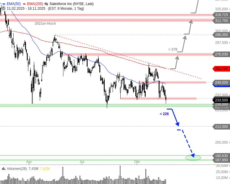 Fazit: Die Salesforce-Aktie ist ein Underperformer am US-Markt und mit dem Erreichen des Triggerbereichs (Jahrestiefs) jetzt ganz oben auf einer Short-Watchlist. Die Käufer müssten einen Durchbruch nach unten zwingend verhindern, ansonsten drohen hier eine Stop-Loss-Welle und möglicherweise eine mittelfristige Abwärtsbewegung.
