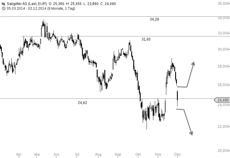 Da gibt es in der Salzgitter Aktie schon einmal ein Aufbäumen der Bullen und dann das. Jüngst wurde das Aus für das Southstream-Projekt bekanntgegeben und dies lässt die Kurse aktuell ordentlich einbrechen. Damit kommt nun die Unterstützung um 24,62 Euro erneut unter Druck, die am 14. November wieder zurückerobert werden konnte und es stellt sich die Frage, ob das damit verbundene Kaufsignal nun zum Fehlsignal mutiert oder aber die aktuelle Abwärtsbewegung lediglich einen testenden Pullback darstellt.