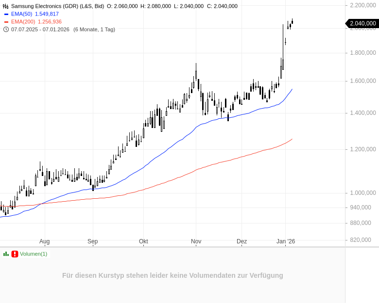 - Samsung Electronics (GDR)Kursstand: 2.040,000 € (L&S) - Zum Zeitpunkt der VeröffentlichungVerkaufenKaufen