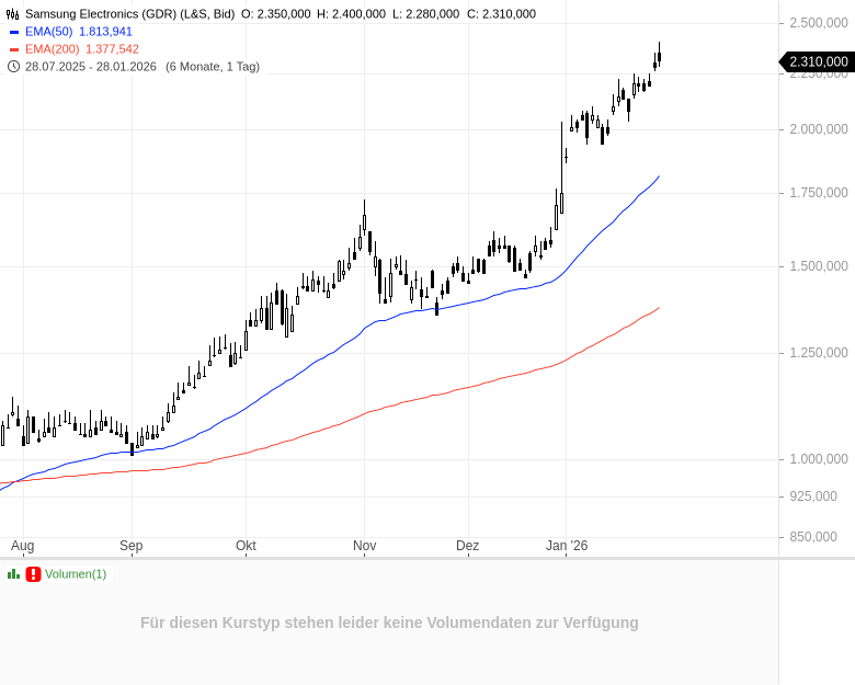 - Samsung Electronics GDRKursstand: 1.698,000 € (L&S) - Zum Zeitpunkt der VeröffentlichungVerkaufenKaufen