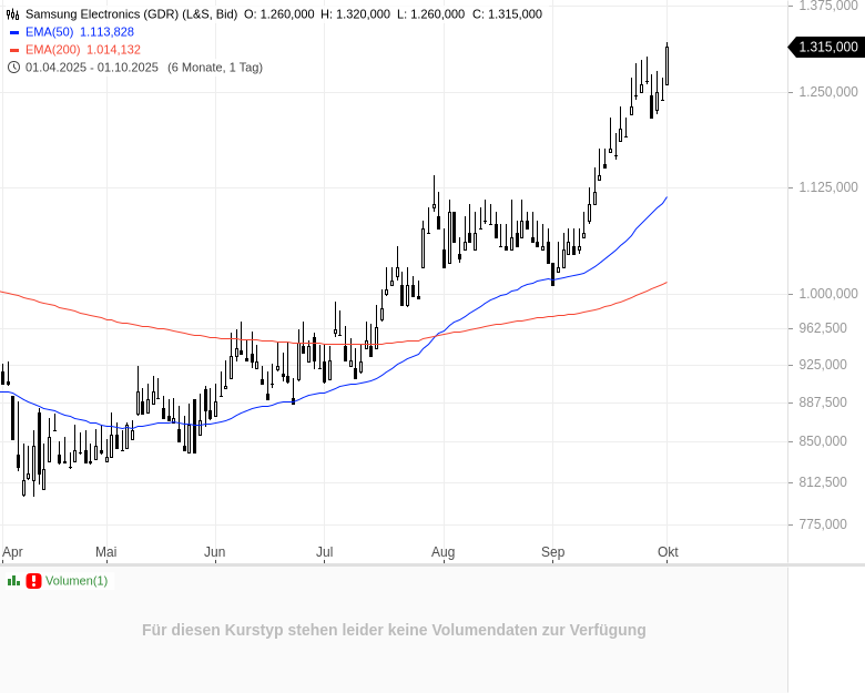 - Samsung Electronics (GDR)Kursstand: 1.320,000 € (L&S) - Zum Zeitpunkt der VeröffentlichungVerkaufenKaufen