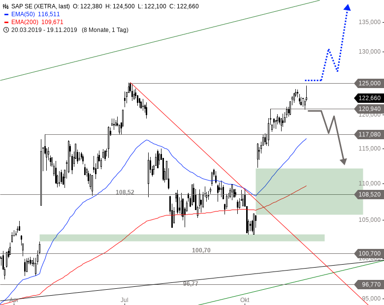 Seitdem zieht die Aktie weiter an, wobei sie am 22. Oktober 2019 ein kleines Zwischenhoch bei 120,94 EUR herausgebildet hat. Am Montag gab diese Marke nach einem kleinen Rücksetzer Halt. Gestern notierte die SAP-Aktie im Hoch bei 124,50 EUR und damit fast am Allzeithoch. In der zweiten Handelshälfte kam es gestern aber zu Gewinnmitnahmen. Der Wert gab einen größeren Teil seiner zwischenzeitlichen Gewinne wieder ab.