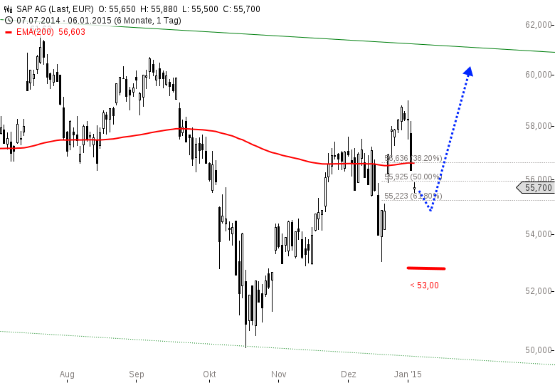 Die SAP Aktie befindet sich seit März 2013 in einer volatilen, aber moderaten Abwärtsbewegung, die im großen Bild als bullisches Flaggenmuster gewertet werden kann. Nach dem letzten Test der unteren Flaggenunterstützung konnte sich ein kleiner Aufwärtstrend etablieren, der in der letzten Woche ein Hoch bei 59 Euro erreichte. Hier kam es zu deutlichen Gewinnmitnahmen. Gestern war die Aktie eine der größten Verlierer und die bärische Tendenz setzt sich heute fort. Damit dringt der Kurs in das noch offene Aufwärtsgap vom 18. Dezember vor und könnte dieses schließen wollen. Im Anschluss daran wäre eine neue Kaufwelle möglich, denn solange die Kurse nachhaltig oberhalb von 53 Euro bleiben, besteht die bereits angesprochene Aufwärtstendenz. Damit sind die nächsten Ziele bei 59,00 und 61,15 Euro auszumachen.