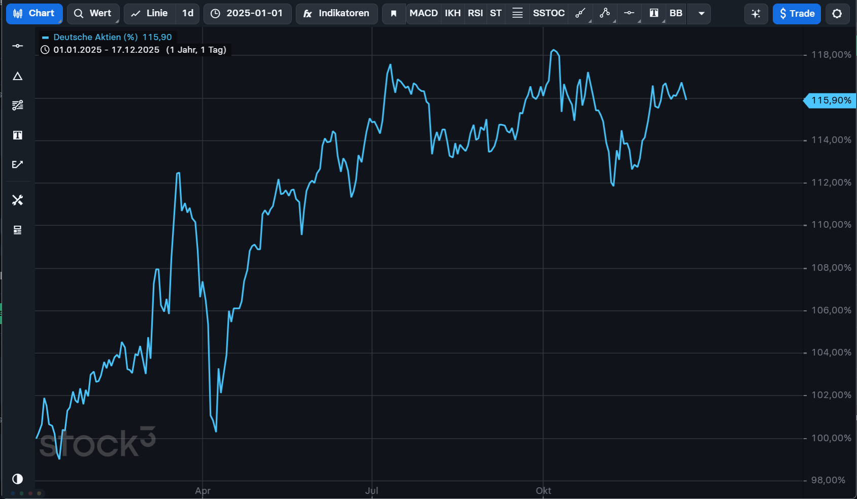 stock3 Ultimate vereint alles: Zugang zu allen technischen Features des stock3 Terminals, zu den Experten-Analysen, Setups und Depots sowie zur exklusiven Community. Das Paket für alle, die maximale Tiefe und volle Unterstützung für ihr Trading suchen. Und das Beste: Bei einer Buchung bis zum 28.12. schenken wir Dir 20 % auf das Jahresabo und obendrauf 12 Monate DAX Indizes. Sichere Dir hier Deinen stock3 Winterdeal!