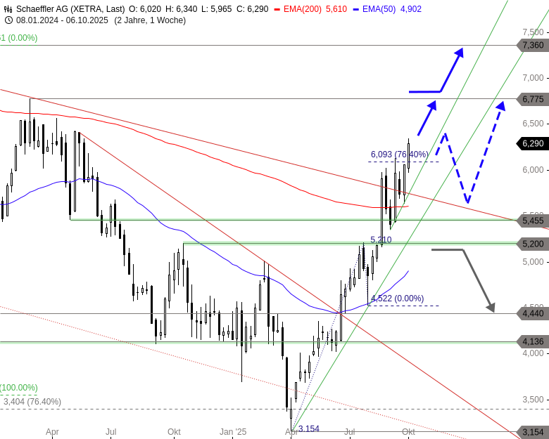 Das Kursziel bei 6,09 EUR ist mittlerweile durch den steilen Anstieg der letzten Tage überwunden und damit der nächste Schritt in Richtung des Hochs aus dem Februar 2024 bei 6,77 EUR gemacht worden.