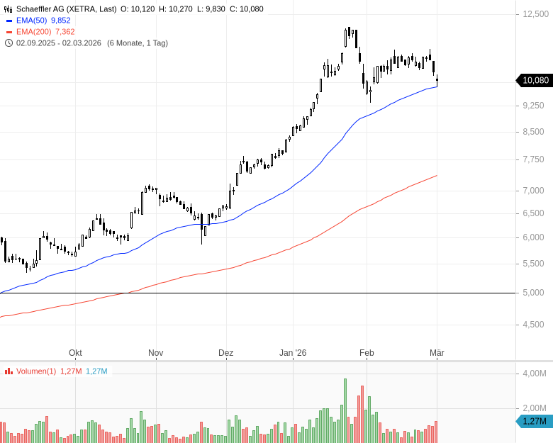 Entscheidend für die negative Kursreaktion dürfte jedoch der Ausblick sein. Für 2026 erwartet Schaeffler ein währungsbereinigtes Umsatzwachstum zwischen minus 4,3 und plus 4,3 %. Die Spanne signalisiert erhebliche Unsicherheit. Auch bei der Profitabilität bleibt das Bild vorsichtig. Die avisierte EBIT-Marge von 3,5 bis 5,5 % liegt im Mittel unter der bisherigen Markterwartung von 5,1 %.