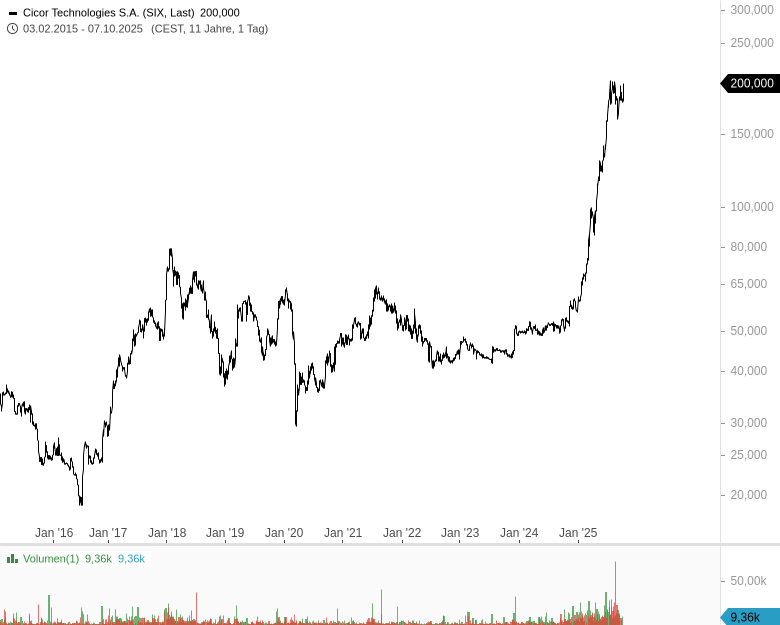 Cicor ist ein Technologieunternehmen aus dem Bereich Elektrotechnik und Elektronik. Die Aktie hat einen beachtlichen Höhenflug hinter sich, nachdem 2024 ein Rallysignal getriggert wurde. Der Linienchart veranschaulicht die enorme Dynamik unter sehr hohen Handelsumsätzen: