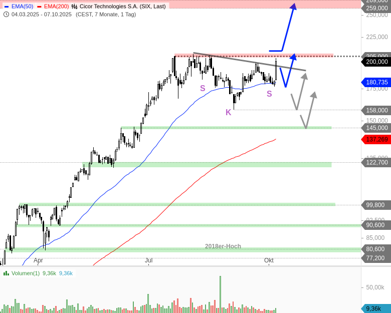 Klettert das Papier nachhaltig über 207 CHF, entstehen Kaufsignale für eine Aufwärtswelle in Richtung 259 - 269 CHF. Vor einem Ausbruch nach oben könnte es aber auch problemlos noch zu Rücksetzern innerhalb der Seitwärtskorrektur kommen. Der EMA50 und die jüngsten Zwischentiefs könnten stützen, unterhalb von 174 wären Pullbacks bis 145 oder 138 CHF denkbar.